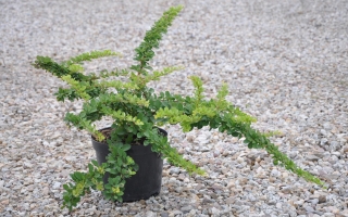 Forma krzewiasta, pokrój rozłozysty, zwarty. Wysokość do 1 metra przy szerokości do około 1,5 metra. Pędy łukowato wygiete z cierniami. Liscie drobne, zielone, w jesieni przebarwiające się na żółto-pomarańczowy kolor. Owoce czerwone, długo utrzymujące się na pędach po zrzuceniu liści. Wymagania glebowe i stanowiskowe charakterystyczne dla gatunku. Polecany szczególnie do nasadzeń w zieleni miejskiej. Wykorzystywany jako roślina okrywowa.