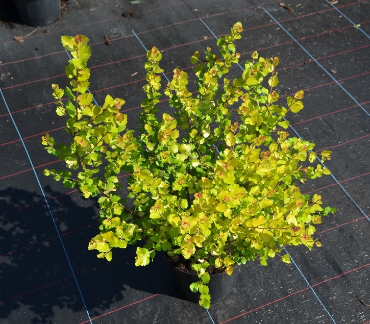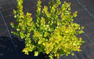 Karłowy krzew o pokroju płaskokulistym, przyrastający rocznie do 10 cm. Liście żółte, okrągłe. Pędy cienkie, w młodości czerwone. Małe wymagania glebowe. Polecany do ogrodów przydomowych, parków, zieleni miejskiej, ogrodów skalnych oraz do pojemników.