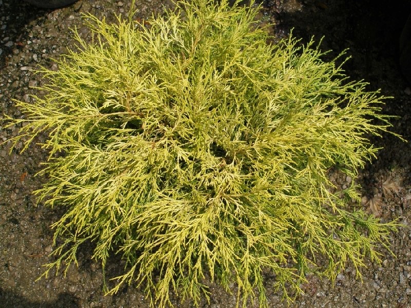 Pół karłowy krzew iglasty o szeroko stożkowym pokroju i żółtym kolorze. Często dorata do 2 m wysokości choć może osiągnąć nawet 6 m wysokości w optymalnych warunkach. Żółte ubarwienie, szczególnie atrakcyjne zimą. U starszych osobników wykształca się czerwonawa łuszcząca się kora. Roślina o średnich wymaganiach siedliskowych, dobrze rośnie zawówno w pełnym słońcu jak i w półcienu.
