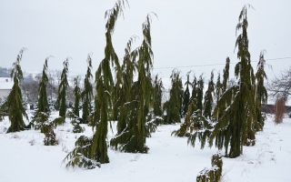 Drzewo szybko rosnące, dorastajace do 15 m wysokości. Pędy boczne zwisające. Łuski intensywnie zielone, szyszki niewielkie do 8 mm.
