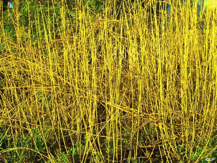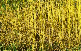 Rozłożysty krzew. Dorasta do 1,5 - 3 m wysokości i 4 m szerokości. Pędy jaskrawozielone lub żółte. Owoce białe. Tolerancyjny w stosunku do gleby. Szczególnie atrakcyjnie wygląda w porze kwitnienia i owocowania. Owoce derenia wykorzystywane są na przetwory i do sporządzania nalewek.