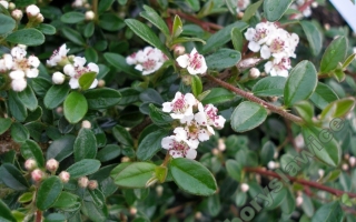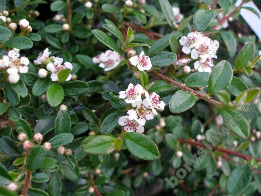 Niski, 15-20 cm wysokości i około 0,8 metra szerokości, krzew o płożących często ukorzeniających się pędach. Liście skórzaste, niewielkie, lśniące, zimozielone. Kwiaty białe, owoce liczne czerwone. Wymagania siedliskowe niewielkie, tolerancyjna w stosunku do rodzaju gleby i stanowiska. Wykorzystywana jako roślina okrywowa, tworzy piękne zimozielone kobierce. Doskonała do umacniania skarp i murków oporowych.