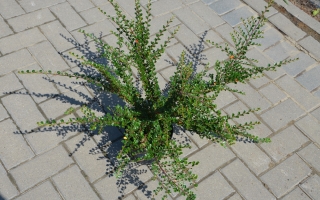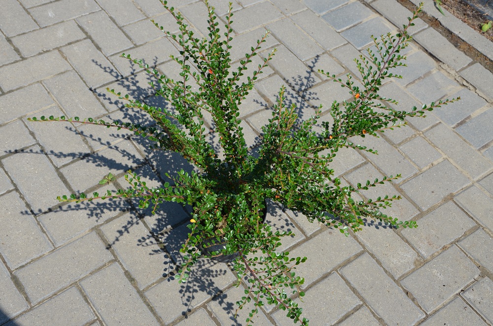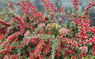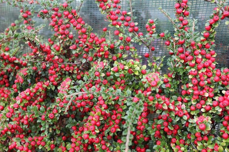 Krzew o wysokości do 1 metra i szerokości do 2 m. Pędy niemal poziome, ozdobnie przewisające, z chrakterystycznymi odgałęzieniami podobnymi do ości ryby. Liście drobne, błyszczące, ciemnozielone, jesienią przebarwiają się na odcienie czerwieni. Kwiaty białe drobne, owoce jasnoczerwone, długo utrzymujące się na pędzie. Małe wymagania glebowe. Wykorzystywana jako roślina okrywowa.