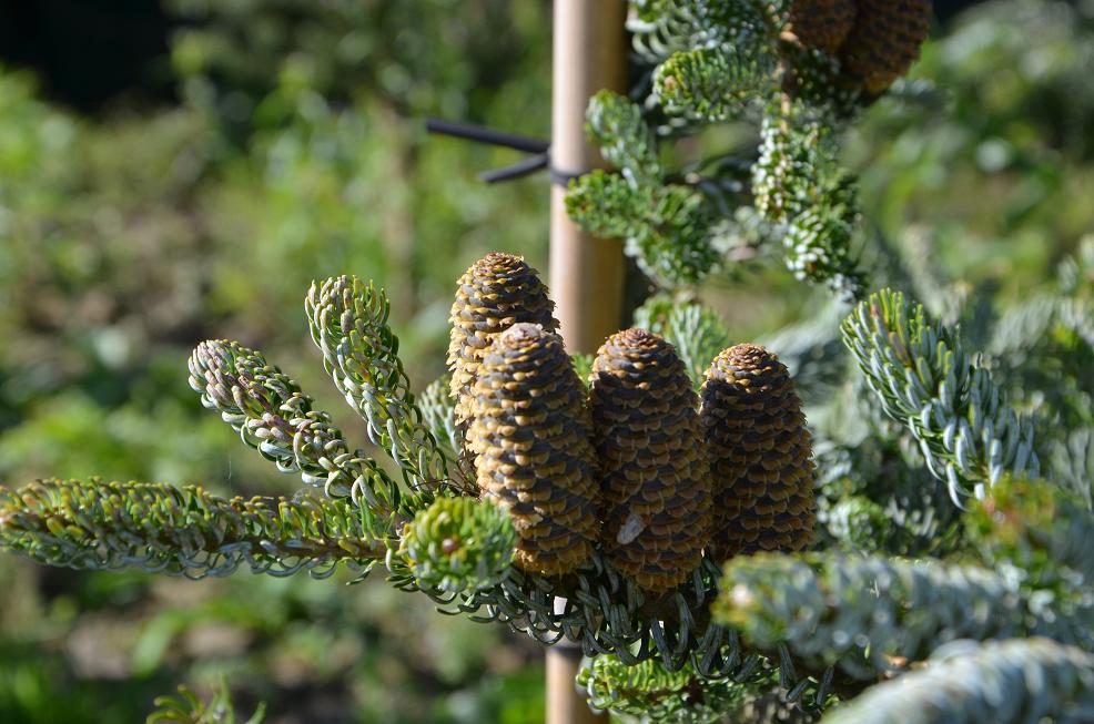 ukazującymi spodnią stronę z białym woskowym nalotem, a także wieloma niebiesko-fioletowymi szyszkami.