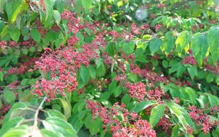 Wolno rosnący krzew z szeroko, poziomo ułożonymi pędami. Osiąga do ok. 2 m wysokości. Liście ciemnozielone, eliptyczne, jesienią fioletowo-brązowe. Kwiaty białe, zebrane w płaskie kwiatostany z dużymi płonnymi kwiatami, kwitnie w maju i czerwcu. Preferuje gleby świeże, próchniczne oraz stanowiska osłonięte. Polecany jako soliter.