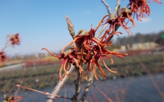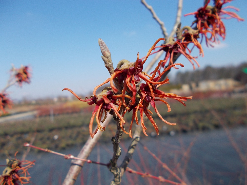 Luźny krzew osiągający około 3-4 m wysokości. Liście owalne, ciemnozielone, pokryte włoskami. Na jesień blaszka liściowa przebarwia sie od żółtego po czerwony i brazowy kolor. Kwitnie w okresie zimy w II-III. Kwiaty zebrane w pęczki, płatki długie frędzlowate barwy czerwonej. Wymaga gleb żyznych, świeżych, przepuszczalnych. Stanowiska słoneczne lub półcieniste ale osłonięte i ciepłe. Bardzo atraktycjnie wyglada zimą obok zimozielonych roślin. Nadaje sie również do nasadzeń soliterowych, ogrodów przydomowych i parków.