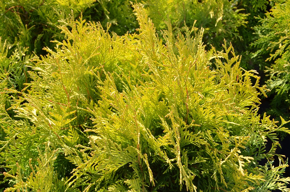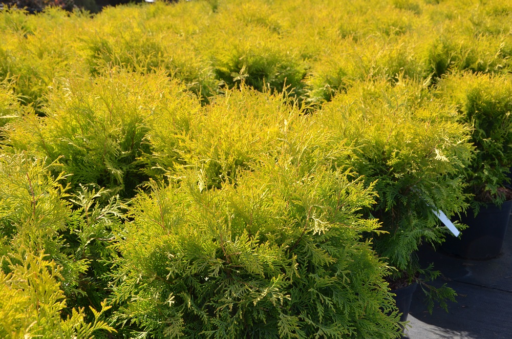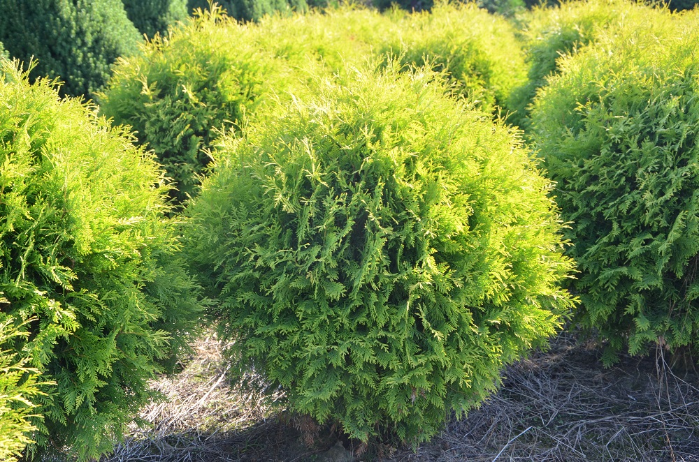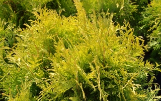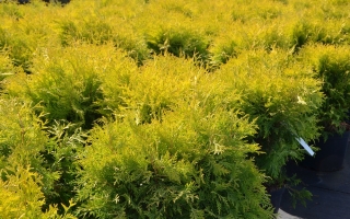 Wolno rosnący krzew o kulistej formie i złocisto-żółtym kolorze.W wieku 10 lat osiąga ok. 0,8 m szerokości.Wymaga żyznej i wilgotnej gleby.Polecany do małych ogrodów.