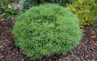 Krzew o karłowym, płaskokulistym pokroju.W wieku 10 lat osiąga ok 0,7 m szerokości.Igiełkowate ulistnienie, pędy delikatne nitkowate, intensywnie zielone.Wymaga żyznej i wilgotnej gleby.Polecany do małych ogrodów skalnych.